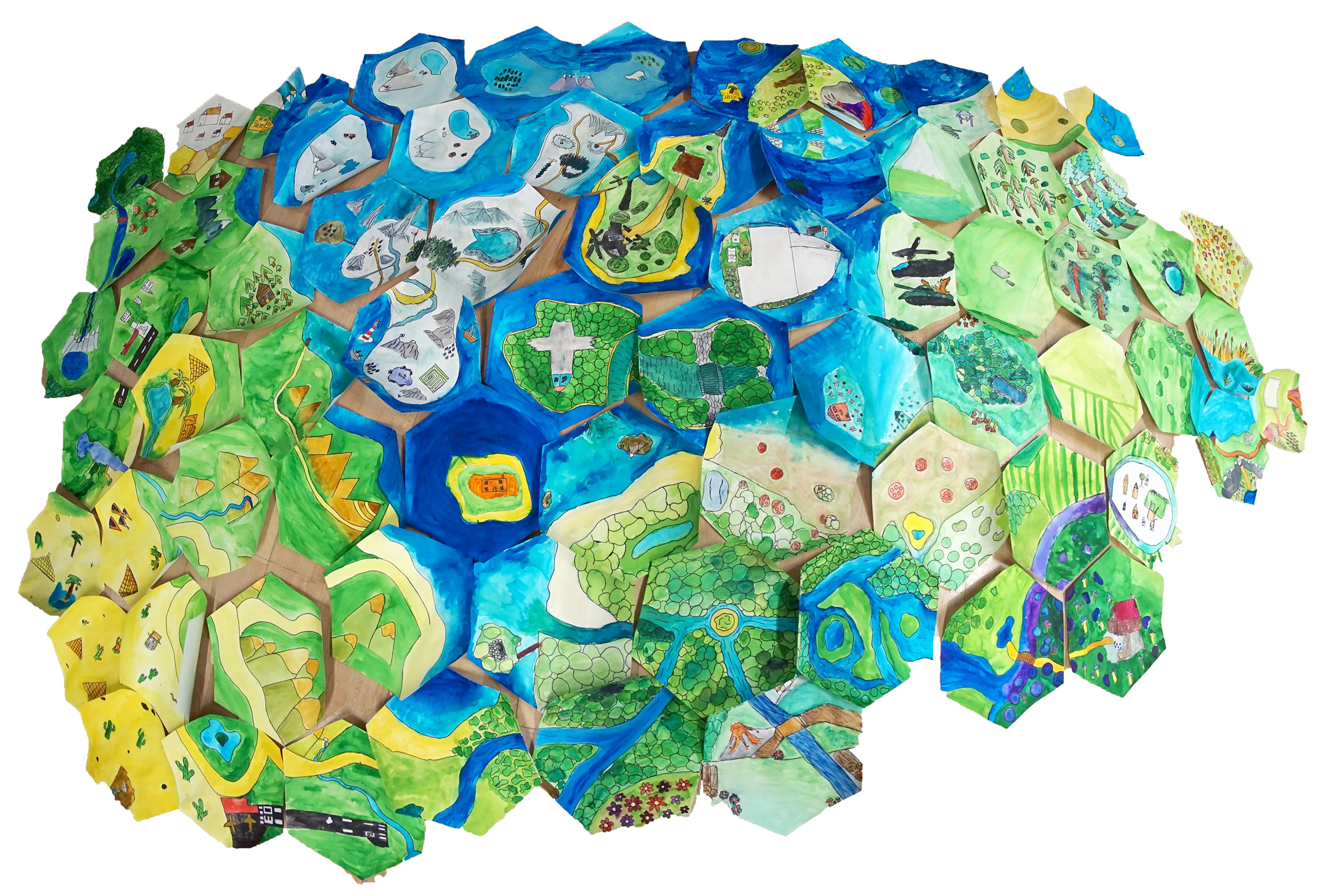 Hra vznikla z obrázků namalovaných na akci Mapy kolem nás 2021 (https://atlas.kraj-lbc.cz/mapy-kolem-nas)  a měla téma Živá planeta (https://atlas.kraj-lbc.cz/malujeme). Při řešení může být pomůckou, že děti malovaly různé biomy, ale skupinka sedící vedle sebe vždy stejný, a že seděly kolem stolu, tak obrázky mohou mít různý směr natočení.