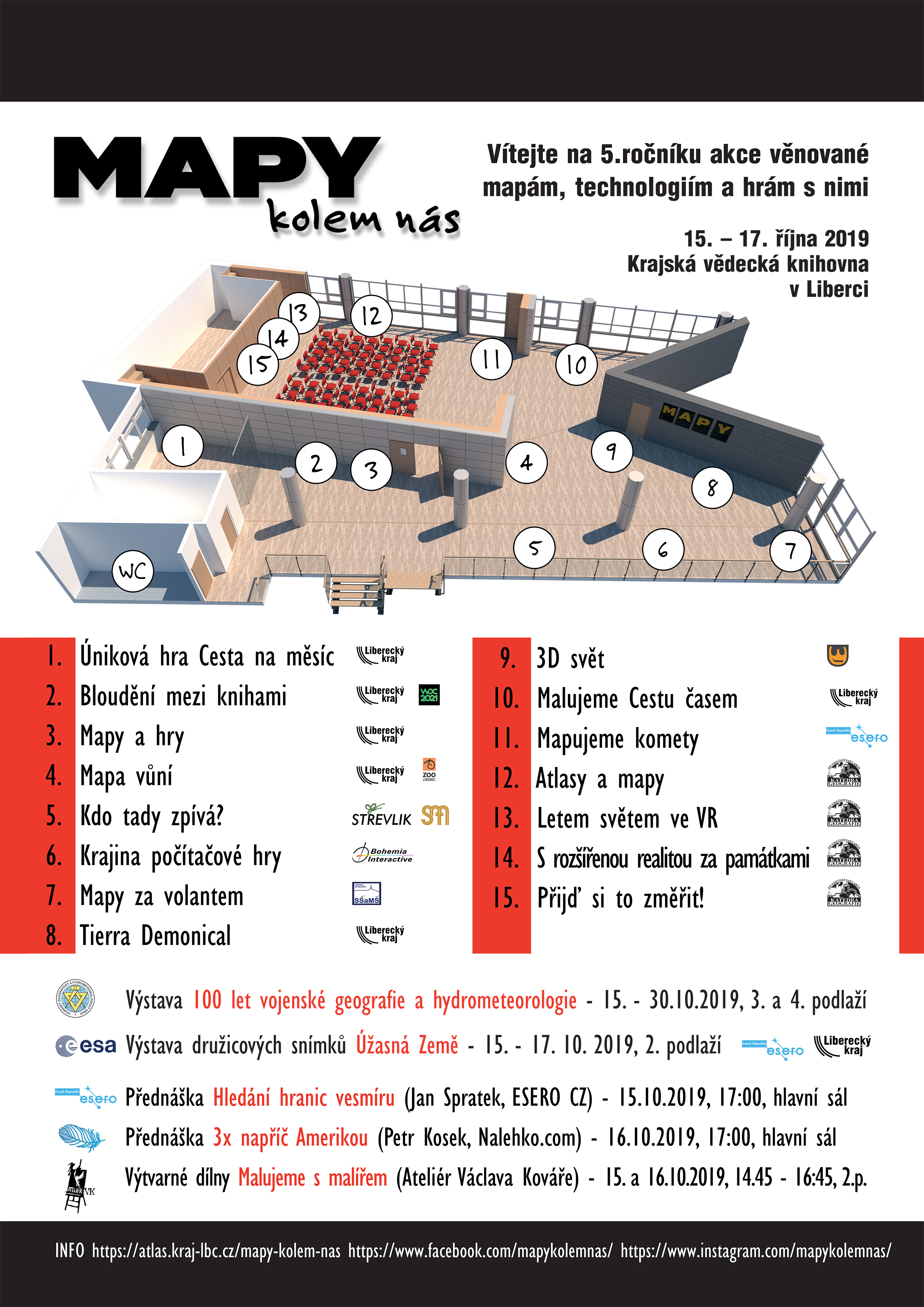 Příznivci map, her a nových technologií! 6. ročník akce Mapy kolem nás je už na spadnutí. Přijďte si vyzkoušet nové technologie a pohrát si s nimi! Zahrajete si mapové hry, které byly vytvořeny v rámci minulých ročníků “Map” (Země malého čaroděje, Ztracené ostrova, Cesta časem, Uzlíkova dobrodružství). Můžete si vyzkoušet mapovou únikovku. Vyzkoušíte si výsledky práce herních profíků. Zástupci Bohemia Interactive tentokrát představí digitální krajinu ve své novince Arma Reforger a také si vyzkoušíte vlastní tvorbu v dobrodružném světě Ylands. A budeme se hodně věnovat vesmíru! Nejen v Mobilním planetáriu. Také bude k vyzkoušení vesmírné stanoviště Planetária Praha. Samozřejmostí už jsou naše "klasiky", třeba 3D tisk a 3D skenování, zvířátkové pásmo Severočeského Muzea, mapa vůní Libereckého kraje, kartičkové hrátky Technické univerzity Liberec nebo představení interaktivního Atlasu od Mapy.cz.