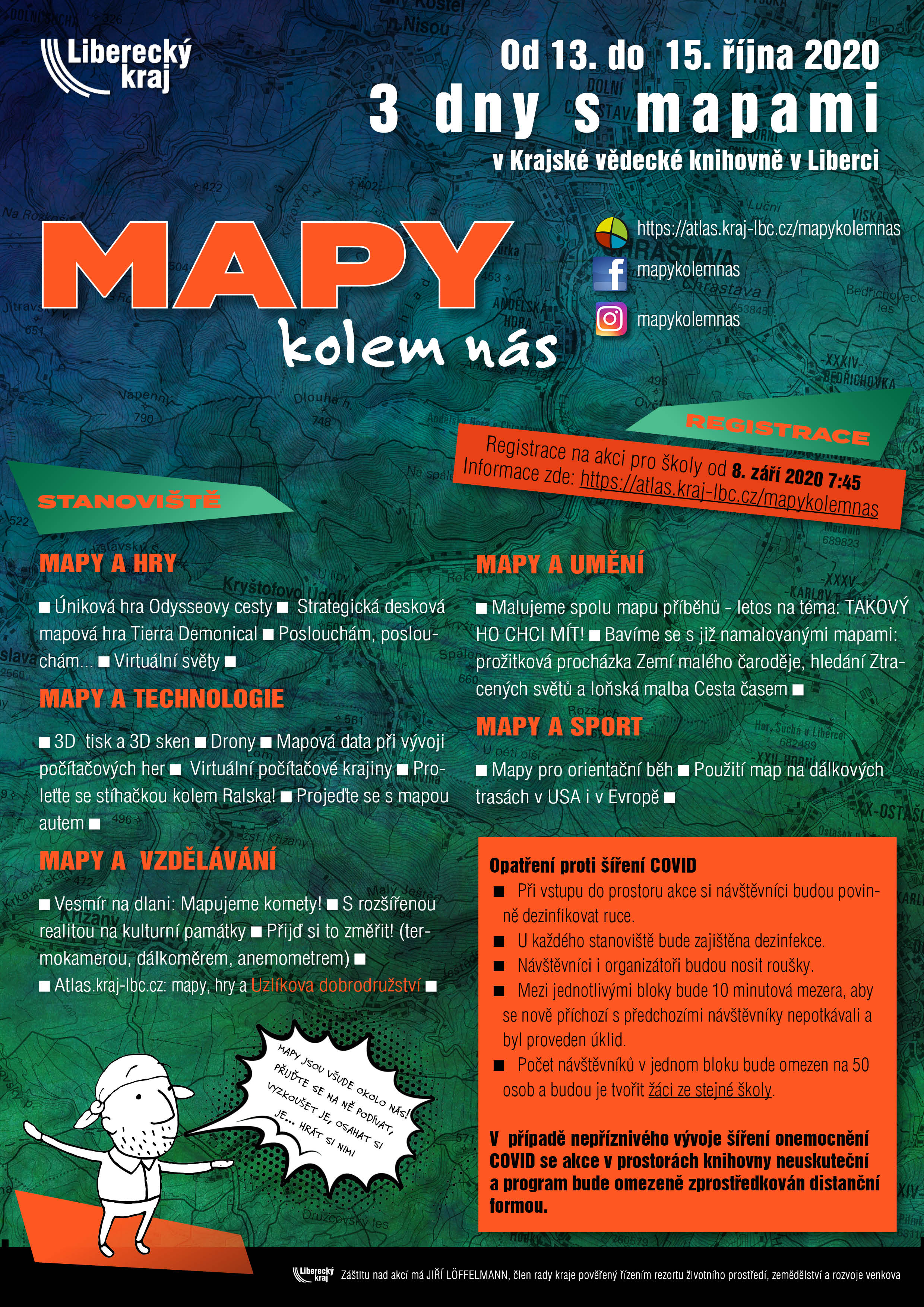 Akci připravujeme s respektováním nutných hygienických opatření s souvislosti zamezením šíření Covid. Termín: od 13. do 15. října 2020. Informace k registraci najdete na samostatné stránce: https://atlas.kraj-lbc.cz/mapy-kolem-nas. Registrace pro školy bude spuštěna od 8.9.2020 od 7:45. Registrujte se na telefonu +420 485 226 412 nebo emailu irena.koskova@kraj-lbc.cz. Časové rozložení bloků a stav registrace najdete zde: https://1url.cz/@mapykolemnas. Prosím, respektujte opatření proti šíření COVID (uvedené níže a na letáku)