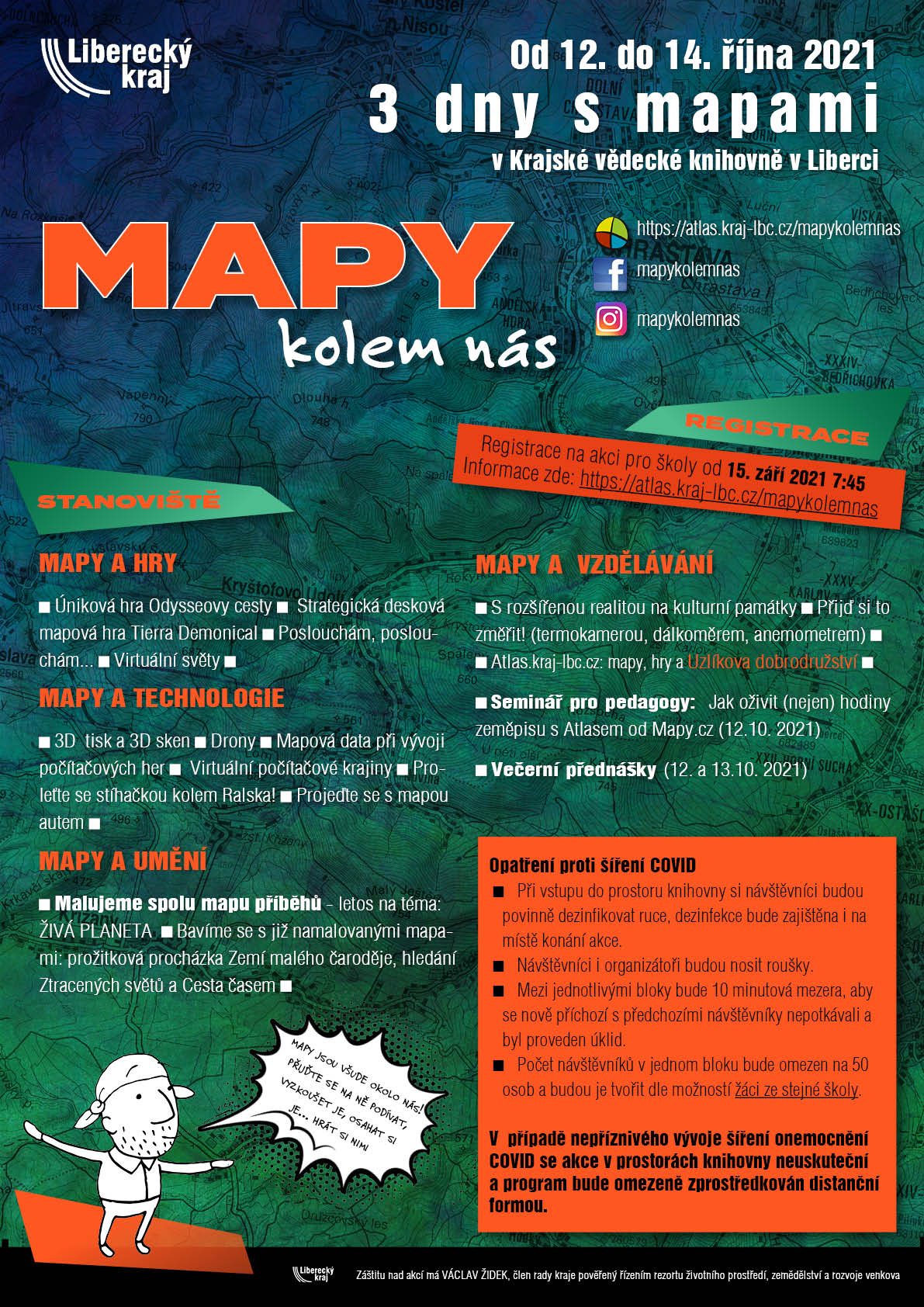 Akci připravujeme s respektováním nutných hygienických opatření s souvislosti zamezením šíření Covid. Termín: od 13. do 15. října 2020. Informace k registraci najdete na samostatné stránce: https://atlas.kraj-lbc.cz/mapy-kolem-nas. Registrace pro školy bude spuštěna od 8.9.2020 od 7:45. Registrujte se na telefonu +420 485 226 412 nebo emailu irena.koskova@kraj-lbc.cz. Časové rozložení bloků a stav registrace najdete zde: https://1url.cz/@mapykolemnas. Prosím, respektujte opatření proti šíření COVID (uvedené níže a na letáku)